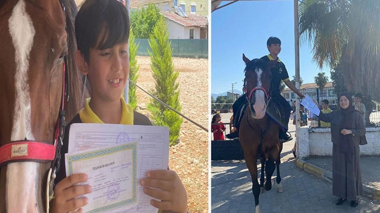 Antalya’nın Serik ilçesinde karne günü unutulmaz anlara sahne oldu. Abdurrahmanlar Ortaokulu 6. sınıf öğrencisi Çınar Önder (12), karne almak için okula safkan Arap atıyla geldi. Görenlerin şaşkın bakışları arasında okul bahçesine giriş yapan Çınar, ilginin odağı oldu.
